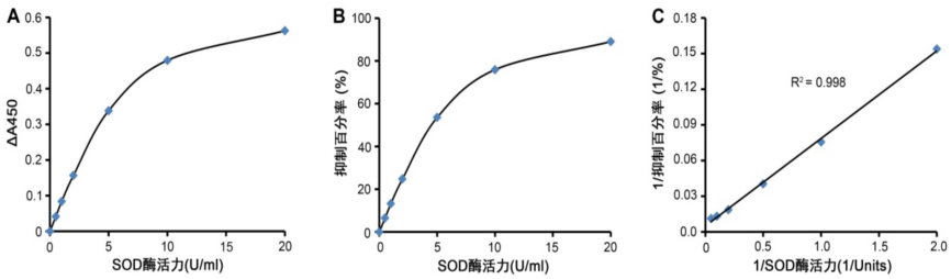 圖2. 本試劑盒對(duì)SOD標(biāo)準(zhǔn)品的檢測(cè)效果。圖A縱坐標(biāo)ΔA450為孵育30分鐘后,空白對(duì)照1與SOD標(biāo)準(zhǔn)品孔的吸光度差值。SOD酶活力和ΔA450及抑制百分率(圖B)呈非線性關(guān)系,而1/SOD酶活力和1/抑制百分率成線性關(guān)系(圖C)。圖中數(shù)據(jù)僅作參考,實(shí)際測(cè)定獲得的標(biāo)準(zhǔn)曲線的斜率和截距可能會(huì)因具體反應(yīng)條件的不同和上圖有較明顯的差別。
