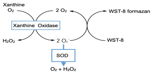 目前測(cè)定SOD比較先進(jìn)的方法包括WST-1法和WST-8法,其中WST-8法比WST-1法更加穩(wěn)定、靈敏度更高。本試劑盒采用了目前測(cè)定SOD方法中穩(wěn)定性更好、靈敏度更高的WST-8法,可以檢測(cè)出低達(dá)0.5U/ml的超氧化物歧化酶。WST-8法的原理參考圖1,WST-8可以和黃嘌呤氧化酶(Xanthine Oxidase, XO)催化產(chǎn)生的超氧化物陰離子(O2.-)反應(yīng)產(chǎn)生水溶性的甲臜染料(formazan dye),由于SOD能催化超氧化物陰離子發(fā)生歧化作用,所以該反應(yīng)步驟可以被SOD所抑制,因此SOD的活性與甲臜染料的生成量成負(fù)相關(guān),從而通過(guò)對(duì)WST-8產(chǎn)物的比色分析即可計(jì)算SOD的酶活力。
