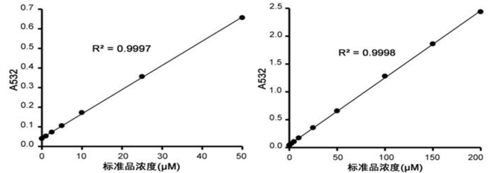 c.水浴冷卻至室溫,1000g室溫離心10分鐘。取200微升上清加入到96孔板中,隨后用酶標(biāo)儀在532nm測(cè)定吸光度。如果不方便測(cè)定532nm的吸光度,也可以測(cè)定530-540nm之間的吸光度。可以設(shè)定450nm為參考波長(zhǎng)進(jìn)行雙波長(zhǎng)測(cè)定。