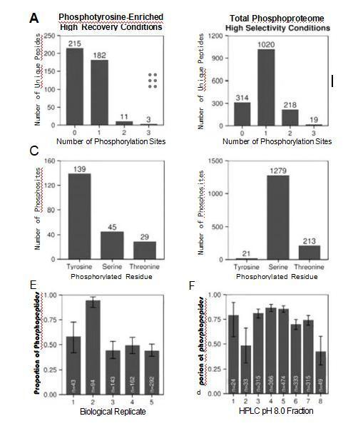 圖 1 .PolyMAC 與磷酸酪氨酸富集(A,C和E)或在PH值為8的RPLC分段進(jìn)行總磷蛋白組識別(B,D和F)的性能