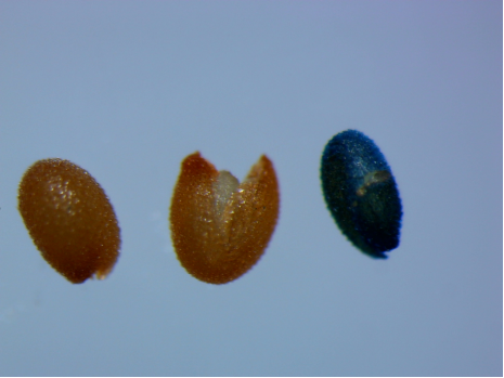 4.觀察:一般染色后,GUS染色陽性的藍(lán)色斑點肉眼就能看到。但是有些材料可能藍(lán)色斑點很細(xì)微,要在顯微鏡下才能看到。