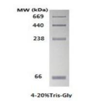 本產品含有 4 種高純蛋白質干粉混合物,總蛋白含量為 160μg。分子量范圍為 66kDa-669kDa,經過非變性電泳后,用考馬斯亮藍染色后可以得到分布均勻、密度相近的 4 條帶。示例如下圖(5μL 上樣):