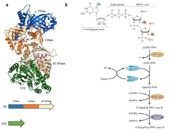 圖1. 牛痘病毒加帽的結(jié)構(gòu)和作用機(jī)理。a. 牛痘病毒加帽酶和 GTP(紅色)、SAH(玫紅)的共結(jié)晶結(jié)構(gòu) (PDB 4CKB) 。該酶由 D1 和 D12 兩個亞基組成,兼具 RNA 三磷酸酶(藍(lán)色)、鳥苷轉(zhuǎn)移酶(橙色)和鳥嘌呤甲基轉(zhuǎn)移酶(米黃色)的功能。本圖引自 Ramanathan, A., Robb, G. B., & Chan, S. H. (2016). mRNA capping: biological functions and applications. Nucleic Acids Res 44(16), 7511–7526. b. mRNA 的帽結(jié)構(gòu)是由一個7-甲基鳥苷通過一個 5′–5′三磷酸酯橋連接到 mRNA 鏈的 5′核苷上組成。Cap-0 結(jié)構(gòu)由相鄰的 RNA 鏈通過三種酶的依次反應(yīng)形成。進(jìn)一步形成 cap-1 結(jié)構(gòu)需要 2-O 甲基轉(zhuǎn)移酶的參與,該修飾可以降低RNA 在體內(nèi)引起的細(xì)胞先天免疫反應(yīng)。本圖引自 Decroly, E., Ferron, F., Lescar, J. et al. (2012). Conventional and unconventional mechanisms for capping viral mRNA. Nat Rev Microbiol 10, 51–65。