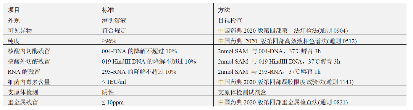 S-(5′-腺苷)-L-甲硫氨酸(SAM,AdoMet)帶有一個(gè)活化甲基,是牛痘病毒加帽酶(GMP-M062)和 mRNA Cap 2’-O 甲基轉(zhuǎn)移酶(GMP-M072)催化甲基化的甲基供體,保存 buffer 配方為:0.005M Sulfuric Acid,10% ETOH。