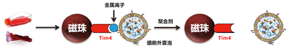 Tim4蛋白固化磁珠,在金屬離子存在的條件下親和細(xì)胞外囊泡表面的磷酯酰絲氨酸(PS),然后使用含有 EDTA 的洗脫液進(jìn)行洗脫,捕獲高純度的完整細(xì)胞外囊泡。