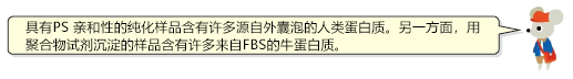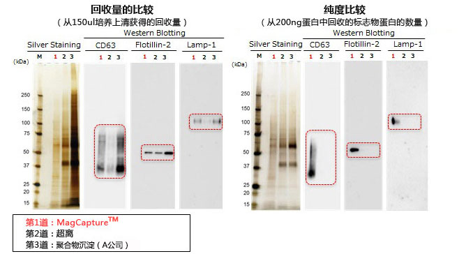 用 PS 親和法、超離法和聚合物沉淀法從 K562 細(xì)胞培養(yǎng)上清(無(wú)血清培養(yǎng)基)獲得樣品進(jìn)行電泳。接著用銀染色和 WB 法(CD63, Flotilin-2 和 Lamp-1 抗體)進(jìn)行實(shí)驗(yàn)。