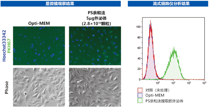 將上述標(biāo)記的外泌體溶液全部加入接種好的 Hela 細(xì)胞中,24小時(shí)后用熒光顯微鏡(左)和流式細(xì)胞儀(右)檢測(cè)捕獲情況。