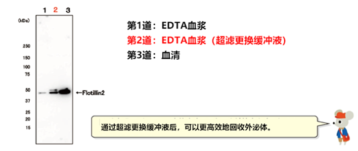 分別從1mL 的 EDTA 血漿、EDTA 血漿(超濾更換緩沖液)、人血清中提取外泌體,進(jìn)行 WB 檢測(cè)(抗 Flotillin2 抗體)。