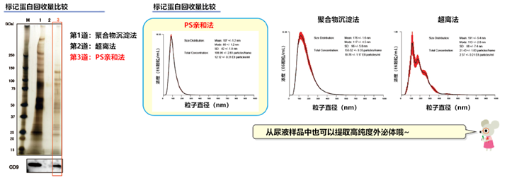 1mL人尿液分別通過(guò)本試劑盒、聚合物沉淀法、超離法進(jìn)行外泌體回收,并做免疫印跡(WB)檢測(cè)(抗 CD9 抗體)。