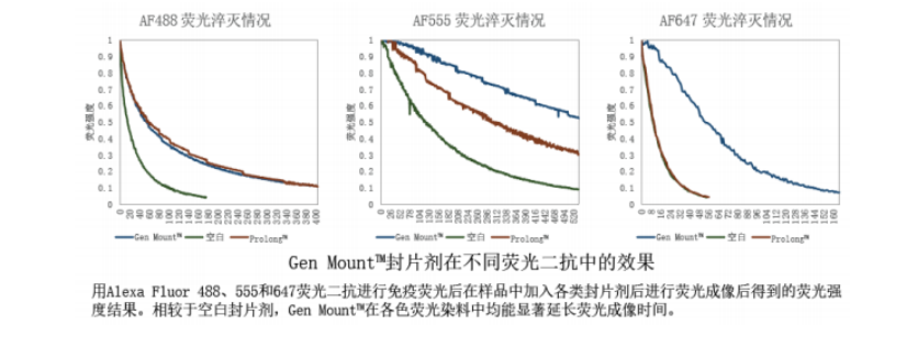 Gen Mount?系列產(chǎn)品是本公司自主研發(fā)的封片劑產(chǎn)品,本產(chǎn)品在延緩熒光淬滅速度,提高熒光亮度和熒光樣品保存方面具有優(yōu)異的性能。其中,Gen Mount? Top 系列為通用型封片 劑,能夠搭配 Gen Fluor?系列熒光二抗,Alexa 系列熒光染料等使用,能夠明顯延長熒光成像 時間。Gen Mount? Bright 是為傳統(tǒng)染料 FITC,TRITC 等開發(fā)的封片劑。 Gen Mount?系列產(chǎn)品折光率為 1.40。