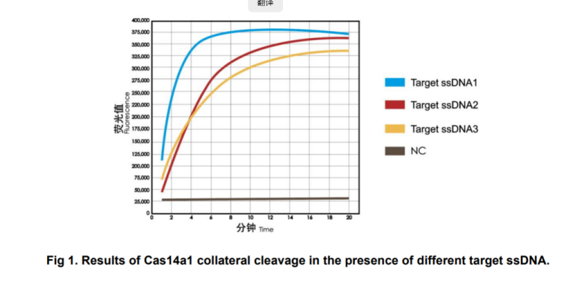 例:若某批次 Un1Cas12f1 酶的反式切割活性為 0.7 transU/pmol,則表明 1 pmol 的該批次 Un1Cas12f1酶可在 1 min 內(nèi),在上述指定的反應(yīng)條件下,反式切割 0.7 pmol ssDNA 探針。本公司提供的 Cas 酶 transU數(shù)值詳見各批號的 COA 檢測報告。