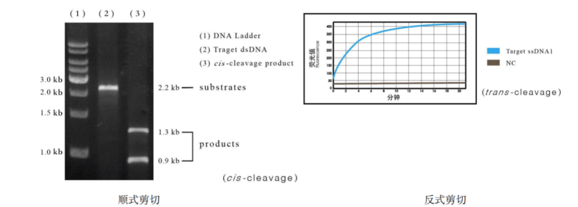 l*若用核酸電泳來(lái)分析順式剪切產(chǎn)物,建議使用 dsDNA靶標(biāo),因?yàn)?ssDNA靶標(biāo)會(huì)被反式激活的 Cas12b 進(jìn)一步切碎。對(duì)于 20 μL 順式剪切應(yīng)體系,推薦 target DNA的使用量為 100 ng500 ng,且 target DNA片段長(zhǎng)度在 300 bp3 kb 范圍內(nèi)。不同長(zhǎng)度 target DNA需要的 Cas 酶和 sgRNA的量需要根據(jù) target DNA的摩爾量計(jì)算,建議保持 Cas :sgRNA:target DNA的摩爾比為 10:10:1,以盡量確保 targetDNA被剪切完全。
