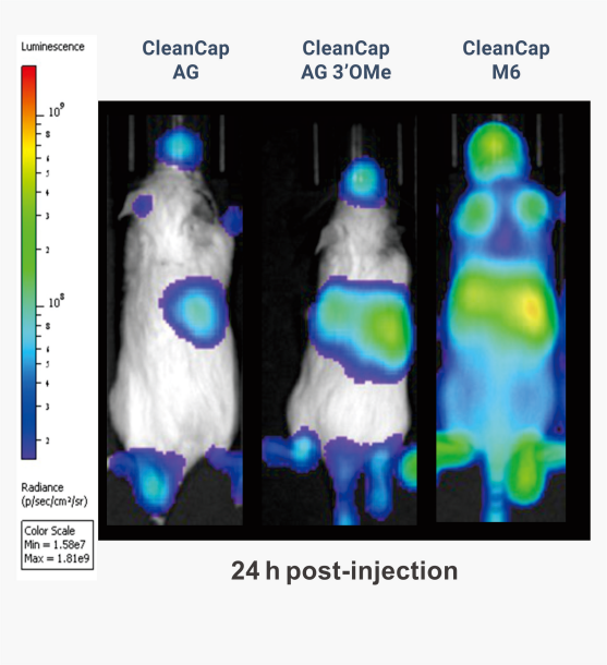 FlucmRNA在LNP遞送系統(tǒng)的尾靜脈注射小鼠模型中的表現(xiàn)。每組1mg/Kg劑量注射后,測(cè)量熒光素酶活性,單位為每秒光子數(shù)。組與組之間的差異只有CleanCap?加帽類(lèi)似物。所有其他變量都受控制。 |