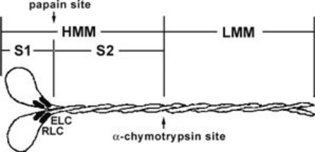 Figure 1. Diagrammatic representation of the myosin II protein and its subfragments. Myosin II or conventional myosin is a hexameric protein consisting of two heavy chains and two light chains. Myosin II can be proteolytically cleaved into heavy meromyosin (HMM, Cat.# MH01) and light meromyosin (LMM) by α-chymotrypsin. Heavy meromyosin consists of the myosin head subfragment-1 domain (S1), its associated light chains (essential light chains and regulatory light chains), and the coiled-coil subfragment -2 domain. Light meromyosin consists of coiledcoil protein structure. The myosin S1-subfragment is produced by papain digestion of HMM.