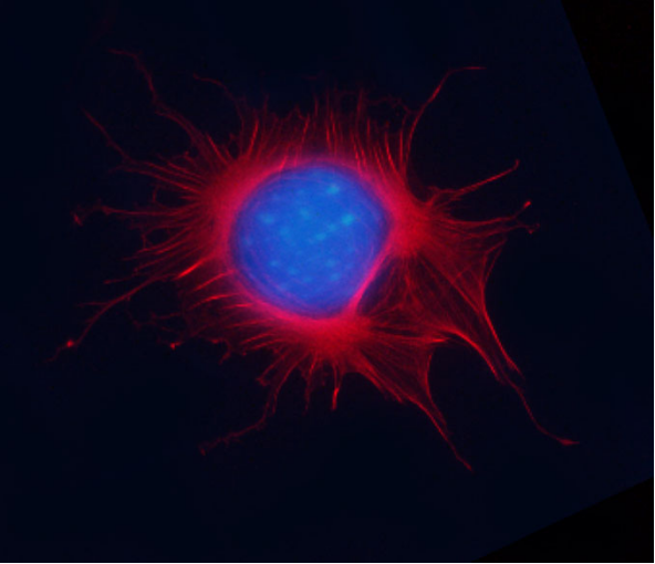 Mitotic Swiss 3T3 cell, F-actin stained with Acti-stain? 670 (far-red, Cat. # PHDN1), nuclear DNA stained with Dapi (blue).