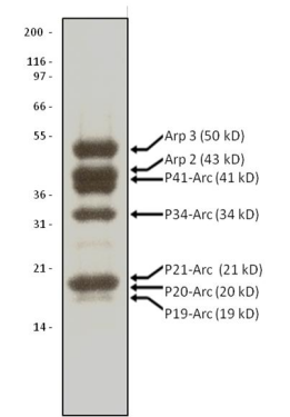 The Arp2/3 protein complex consists of 7 protein subunits, all present in approximately equal stoichiometry (see Figure 1). The Arp2/3 complex is a key regulator of actin filament nucleation and the protein subunits are highly evolutionarily conserved. The protein complex has been purified from porcine brain and is supplied as a lyophilized powder. When reconstituted with distilled water, the complex is in the following buffer: 20 mM Tris pH 7.5, 25 mM KCl, 1 mM MgCl2, 0.5 mM EDTA, 0.1 mM ATP, 1% dextran and 5% sucrose. The molecular weight of the Arp2/3 complex is 224 kDa.