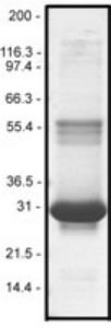 Figure 1: His-H-Ras protein purity determination. A 10 μg sample of RS01 (His-H-Ras molecular weight approx. 28 kDa) was separated by electrophoresis in a 12% SDS-PAGE system. The protein was stained with Coomassie Blue.