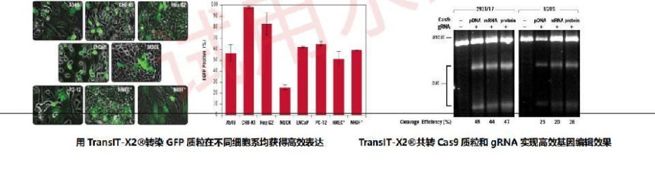 用 TransIT-X2?轉(zhuǎn)染 GFP 質(zhì)粒在不同細(xì)胞系均獲得高效表達(dá) TransIT-X2?共轉(zhuǎn) Cas9 質(zhì)粒和 gRNA 實(shí)現(xiàn)高效基因編輯效果