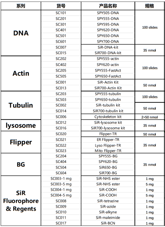 Spirochrome公司開發(fā)的活細(xì)胞成像探針是可滲透細(xì)胞的化合物,可染色活細(xì)胞中的微管(SiR-Tubulin)、F-actin (SiR-Actin)、溶酶體(SiR-Lysosome)和染色體DNA (SiRDNA)。還可提供:下一代活細(xì)胞SPYTM探針,膜張力FLIPPER TR探針,以及spirochrometm的bg-substrate。