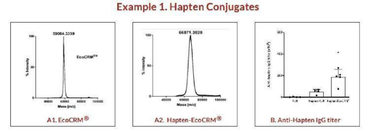 A. MALDI-TOF 法表征載體蛋白和結(jié)合物。與半抗原偶聯(lián)前 (A1) 和偶聯(lián)后 (A2) 分析 EcoCRM? 載體蛋白。使用在高質(zhì)量線性模式下操作的 Applied Biosystems/MDS SCIEX 54800 MALDI TOF/TOF 分析儀分析樣品。