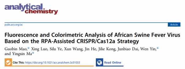 2023年5月11日,中國科學(xué)院深圳先進技術(shù)研究院合成生物學(xué)研究所馬英新課題組與湖北大學(xué)印文博士合作,在 Analytical Chemistry 期刊上發(fā)表了題為:Fluorescence and Colorimetric Analysis of African Swine Fever VirusBased on RPA-Assisted CRISPR/Cas12a Strategy 的補充封面論文。