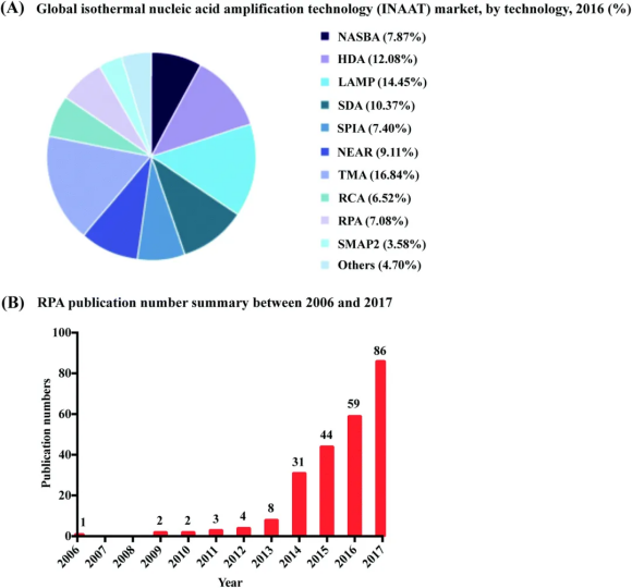 圖1 RPA首次推出以來(lái)的市場(chǎng)份額和出版物數(shù)量匯總。(A): RPA在等溫核酸擴(kuò)增技術(shù)中的市場(chǎng)份額百分比。經(jīng)參考文獻(xiàn)7許可轉(zhuǎn)載。版權(quán)所有2018 Grand View Research, Inc. (B):基于web of science收集的數(shù)據(jù),2006 - 2017年RPA出版物編號(hào)。