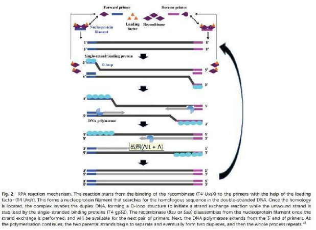 RPA的基本反應(yīng)機(jī)制依賴(lài)于對(duì)稱(chēng)為同源重組的自然細(xì)胞過(guò)程的綜合工程適應(yīng),這是DNA代謝的關(guān)鍵過(guò)程。標(biāo)準(zhǔn)的RPA反應(yīng)試劑包括三個(gè)關(guān)鍵蛋白(重組酶、重組酶裝載因子和單鏈結(jié)合蛋白),隨后與輔助成分如脫氧核糖核酸(DNA)聚合酶、擁擠劑、能量/燃料成分(如三磷酸腺苷、ATP)和鹽分子協(xié)調(diào),執(zhí)行RPA反應(yīng)機(jī)制(圖2)詳細(xì)的反應(yīng)組分及其典型濃度和作用