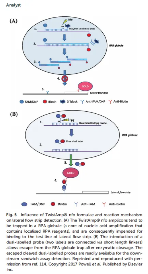 與橫向流動(dòng)條帶檢測(cè)一樣,可以直接使用RPA擴(kuò)增子,但建議在運(yùn)行條帶之前用運(yùn)行緩沖液(例如1/100稀釋)稀釋擴(kuò)增子,以(1)提高其吸濕性能114和(2)避免“鬼帶”效應(yīng)。45,54,115 - 117值得注意的是,Powell及其同事指出,通過(guò)替換高分子量PEG (5.5% 35 kDa;114 .另見(jiàn)2.1節(jié)),在RPA試劑配方中使用低分子量PEG (6.5% 3 kDa)。此外,Powell及其同事還開(kāi)發(fā)了一種方法,以減輕橫向流動(dòng)條帶檢測(cè)的稀釋步驟。他們發(fā)現(xiàn),有時(shí)RPA擴(kuò)增子在“RPA微球”中不可用(核酸擴(kuò)增的核心包含局部的RPA試劑圖5A)。其形成與PEG高度相關(guān),用于結(jié)合到側(cè)流條測(cè)試線上。然而,使用雙標(biāo)記探針(兩個(gè)標(biāo)簽通過(guò)短長(zhǎng)度連接物連接)可以在酶切后從“RPA球”中逃逸,允許擴(kuò)增子準(zhǔn)備好進(jìn)行下游三明治檢測(cè)(圖5B)114。