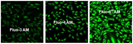 除了方便的488 nm激發(fā)波長和鈣的大熒光增強(qiáng)外,Fluo-8?在細(xì)胞中比Fluo-3和Fluo-4更亮,如圖1所示。此外,Fluo-8?更容易裝入 比Fluo-3和Flu-4活細(xì)胞,兩者都需要37°C才能獲得最佳的細(xì)胞負(fù)載。 Fluo-8?試劑具有較低的溫度依賴性細(xì)胞負(fù)載特性,在室溫或37°C下也能得到相似的結(jié)果。 這一特性使Fluo-8?更適合HTS應(yīng)用。
