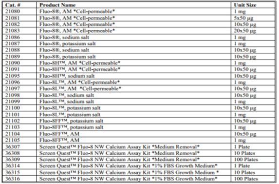 注意:非離子型洗滌劑Pluronic?F-127有時用于增加Fluo-8?AM的水溶性酯。各種Pluronic?F-127解決方案可從AAT Bioquest購買。