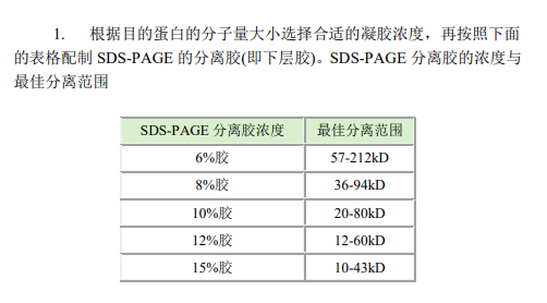 1 根據(jù)目的蛋白的分子量大小選擇合適的凝膠濃度(參考表1)