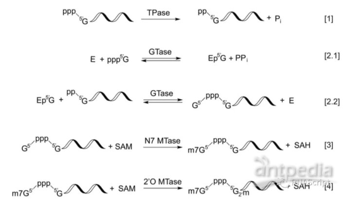 真核生物的mRNA加帽過程需要多種加帽酶的參與。如圖3所示,RNA三磷酸酶(TPase)從5’-三磷酸中去除 γ-磷酸,生成 5’-二磷酸 RNA(反應(yīng) 1)。RNA 鳥苷酸轉(zhuǎn)移酶(GTase)通過賴氨酸-GMP 共價中間體將 GMP 基團(tuán)從 GTP 轉(zhuǎn)移到 5’-二磷酸(反應(yīng) 2.1 和 2.2)。嘌呤-N7 甲基轉(zhuǎn)移酶(鳥嘌呤-N7 MTase)在鳥嘌呤帽的N7胺上添加一個甲基,形成基本帽結(jié)構(gòu)(Cap0)(反應(yīng) 3)。