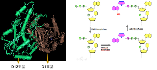 牛痘病毒加帽酶能夠在一小時(shí)之內(nèi)對(duì)mRNA進(jìn)行加帽,效率達(dá)到100%,并且方向正確。它同時(shí)兼具mRNA三磷酸酯酶活性、鳥(niǎo)苷?;D(zhuǎn)移酶活性和鳥(niǎo)嘌呤甲基轉(zhuǎn)移酶活性。而這三種酶活性是由D12和D1兩個(gè)亞基構(gòu)成(下圖)。其中,D1亞基具有RNA 三磷酸酶和鳥(niǎo)苷轉(zhuǎn)移酶活性;D12 亞基具有鳥(niǎo)嘌呤甲基轉(zhuǎn)移酶活性。