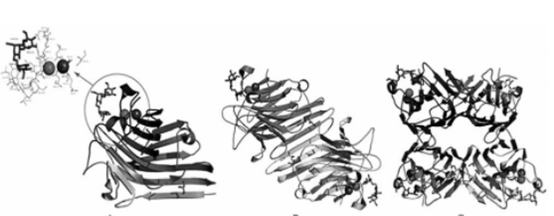圖2. A)ConA monomer, B) ConA dimer, C) ConA tetramer with mannose, glucose and metal ions.
