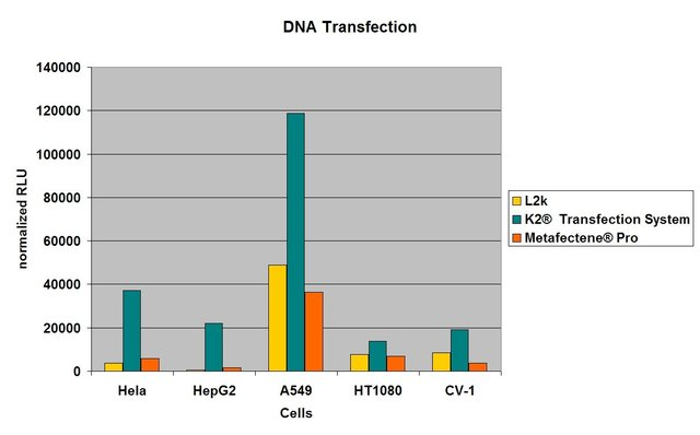 K2轉(zhuǎn)染pCMV-GFP的效率? 轉(zhuǎn)染系統(tǒng)和Metafectene Pro與幾種細(xì)胞系的市售轉(zhuǎn)染試劑L2k進(jìn)行了比較。