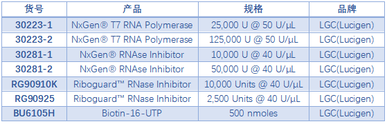 T7 RNA聚合酶是一種高度特異性識別T7啟動子序列的DNA依賴的5'→3'RNA聚合酶。LGC(Lucigen)提供用于體外轉(zhuǎn)錄的高活性、高性價比的NxGen? T7 RNA Polymerase,進口的品質(zhì),國產(chǎn)的價格!此外還提供體外轉(zhuǎn)錄試劑盒以及RNA合成標(biāo)記原料Biotin-16-UTP。