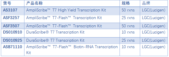 使用AmpliScribe? T7-Flash? Transcription Kit可在30分鐘生產(chǎn)高產(chǎn)量RNA,用于CRISPR(gRNA),體外翻譯,RNA干擾,結(jié)構(gòu)研究,反義研究和雜交檢測(RNA探針)等應(yīng)用。