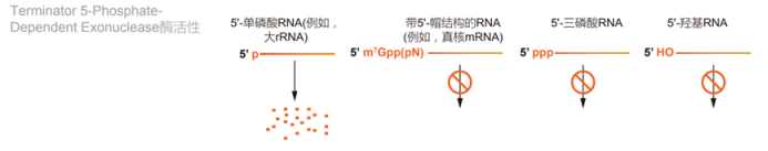 Terminator Exonuclease是一種5'→ 3'進行性核酸外切酶,可降解帶有5‘單磷酸的RNA。它不會降解具有5'三磷酸、5'-帽結(jié)構(gòu)(例如大多數(shù)真核mRNA帶有的5'-帽結(jié)構(gòu))5'OHRNA。它也消化帶有5'單磷酸的DNA。該酶不受蛋白形式的RNase抑制劑的抑制。