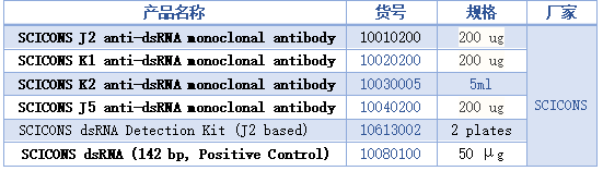 SCICONS(匈牙利)作為全球唯一一家dsRNA抗體供應(yīng)商,提供J2、J5、K1、K2四種anti-dsRNA單克隆抗體,其中J2抗體是dsRNA檢測的金標(biāo)準(zhǔn)??梢杂糜贓LISA、免疫熒光、流式、免疫沉淀等實驗,參考文獻700余篇。值得一提的是,Moderna的dsRNA污染檢測方法便是使用SCICONS的抗體。