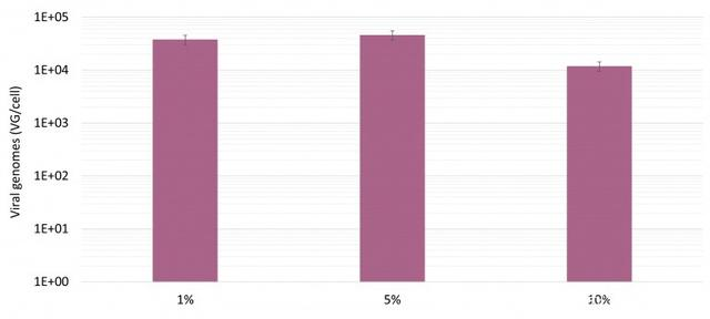 通常,轉(zhuǎn)染復(fù)合體積占最終細(xì)胞培養(yǎng)體積的10%,這在擴(kuò)大生產(chǎn)規(guī)模時(shí)可能會(huì)導(dǎo)致技術(shù)限制。FectoVIR-AAV經(jīng)過優(yōu)化,可將絡(luò)合量降低至1%,從而有助于制備用于大規(guī)模生產(chǎn)的轉(zhuǎn)染復(fù)合物。例如,對(duì)于200 L的細(xì)胞懸液體積,轉(zhuǎn)染復(fù)合體積可以從20 L (10%)降至2 L (1%)進(jìn)行優(yōu)化。