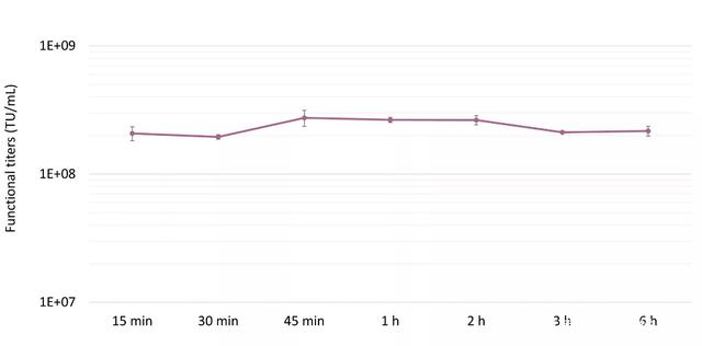 大規(guī)模瞬時(shí)轉(zhuǎn)染需要向懸浮細(xì)胞培養(yǎng)物中添加更大體積的轉(zhuǎn)染復(fù)合物,這意味著更長的轉(zhuǎn)移時(shí)間。使用FectoVIR-AAV,轉(zhuǎn)移時(shí)間不再是可以導(dǎo)致病毒滴度產(chǎn)量變化的限制因素。FectoVIR-AAV轉(zhuǎn)染復(fù)合物顯示出極大的穩(wěn)定性:將FectoVIR-AAV轉(zhuǎn)染試劑和質(zhì)粒DNA混合后,可以在6h內(nèi)可靠地將轉(zhuǎn)染復(fù)合物添加到細(xì)胞中,而rAAV滴度產(chǎn)量沒有明顯變化。