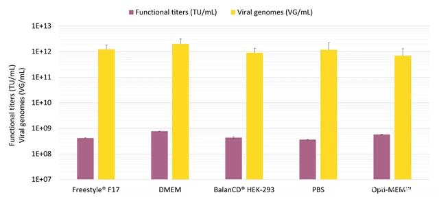 合成細(xì)胞培養(yǎng)基的選擇特定于每個(gè)rAAV制造平臺(tái)。FectoVIR-AAV/DNA復(fù)合物的效率已在不同的市售合成復(fù)合介質(zhì)中進(jìn)行了全面測(cè)試,并且效價(jià)收率在各種測(cè)試介質(zhì)中的變化很小。