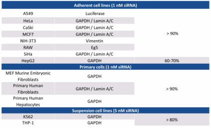 對多數(shù)貼壁細胞或原代細胞,1 nM siRNA能夠達到超過90%的基因沉默。對于懸浮細胞,使用5 nM siRNA依然能達到80%的沉默效率。