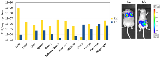 in vivo-jetPEI? 可在任何器官或組織中,通過基因過表達或者基因抑制的方法進行基因功能研究。它可以通過全身和局部注射目標多種器官。注射途徑在很大程度上決定了靶器官。例如,在靜脈注射時, in vivo-jetPEI?遞送的 DNA 主要在肺部表達,也在肝臟、胰腺、腎臟、脾臟、膀胱、心臟和動脈中表達。而腹腔注射,基因在卵巢、胰腺、膈肌、子宮和胃中表達 (Fig. 1)。為了實現(xiàn)器官特異性基因表達,可以結合細胞特異性啟動子和局部注射途徑,達到在特定器官/組織中的基因表達。
