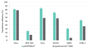 jetMESSENGER? 在難轉染細胞中非常高效,相比于其他mRNA轉染試劑