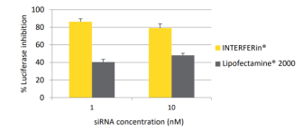 一些文獻表明轉染低濃度的siRNA能夠避免脫靶效應。確實,當轉染高濃度siRNA時,會觀察到這些非特異性的副作用。因此通過使用盡可能少的siRNA可以提高實驗數(shù)據(jù)的可靠性。INTERFERin? 專為此而設計:使用低濃度siRNA達到高效率基因沉默。