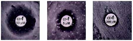 α-因子活性測定。α因子肽信息素(10 μl)作用于MATa細胞草坪上的無菌過濾器,分別為野生型BAR1 (200 μM,右)pro挑逗或BAR1 Δ (50 μM,左;5μM,中心)。敏感的α-因子明顯表現(xiàn)為清理區(qū)(G1逮捕了細胞)。BAR1蛋白酶缺失的細胞對α-因子的活性比bar -1蛋白酶陽性的野生株高需要多20 - 50倍的信息素來阻止細胞。