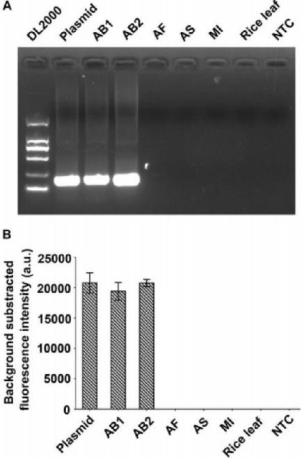 初步建立 RPA-Cas12a-Ab檢測(cè)體系后,研究者們測(cè)試了該體系的特異性。結(jié)果表明,RPA-Cas12a-Ab檢測(cè)體系對(duì)2例水稻干尖線蟲(chóng)樣本(AB1、AB2)和含水稻干尖線蟲(chóng)目標(biāo)片段的質(zhì)粒檢測(cè)呈陽(yáng)性;而對(duì)3例非水稻干尖線蟲(chóng)樣本(AF、AS、MI),以及水稻葉片基因組樣本(Rice Leaf)均無(wú)擴(kuò)增,也無(wú)CRISPR檢切信號(hào),結(jié)果為陰性。證明了RPA-Cas12a-Ab檢測(cè)方法的特異性(圖4)。