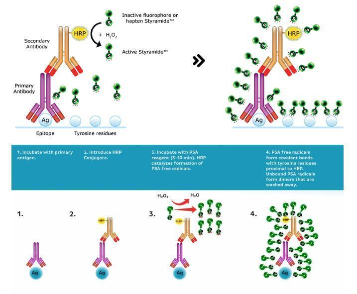 酪胺信號放大(TSA)是一種基于辣根過氧化酶(HRP)的催化活性對靶蛋白或核酸進(jìn)行高密度原位標(biāo)記的酶學(xué)檢測方法。原理為酪胺Tyramide的過氧化物酶反應(yīng)(已標(biāo)記熒光的酪胺在HRP催化H2O2下形成共價(jià)鍵結(jié)合位點(diǎn))產(chǎn)生的大量酶促產(chǎn)物與目標(biāo)蛋白的酪氨酸殘基共價(jià)結(jié)合,從而使目標(biāo)蛋白標(biāo)記上特異的熒光或生物素。