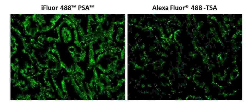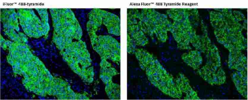 圖2.分別用iFluor 488 PSA和Alexa Fluor 488 TSA染色甲醛固定的石蠟包埋人肺腺癌陽性組織的染色結(jié)果圖。人肺腺癌陽性組織切片用兔抗EpCam抗體染色,然后用polyHRP標(biāo)記的山羊抗兔IgG二抗孵育,后使用iFluor 488 PSA (Cat#45020)和Alexa Fluor 488 TSA分別染色。圖像顯示iFluor 488 PSA與Alexa Fluor 488 TSA相比提高了熒光IHC的靈敏度。